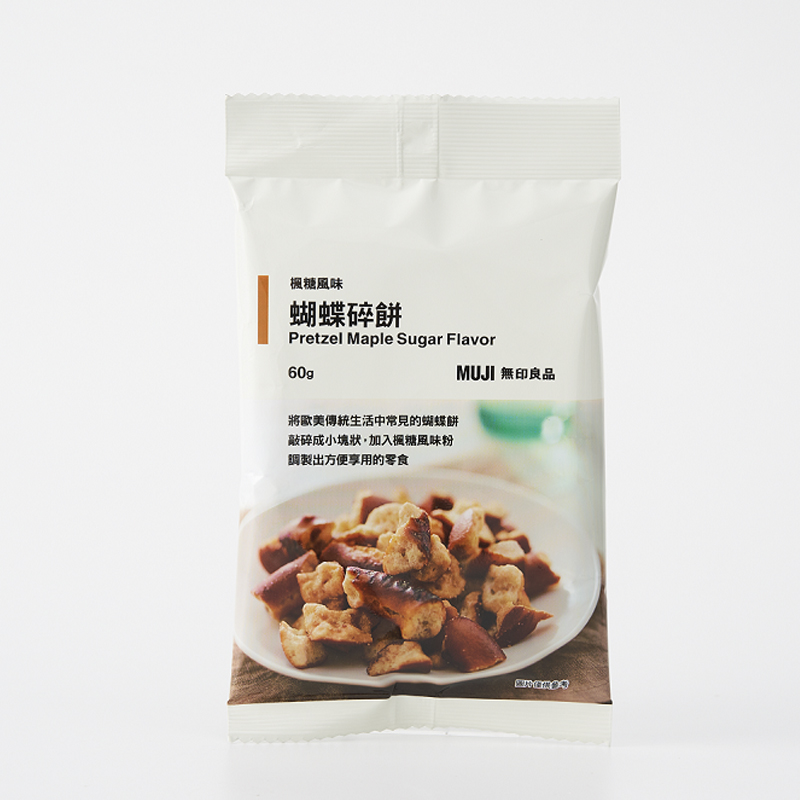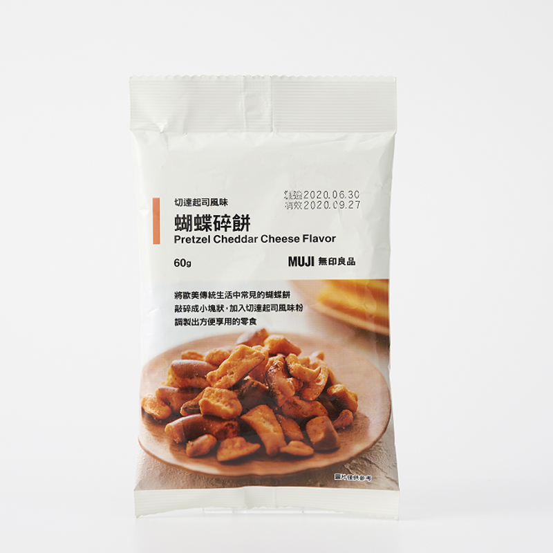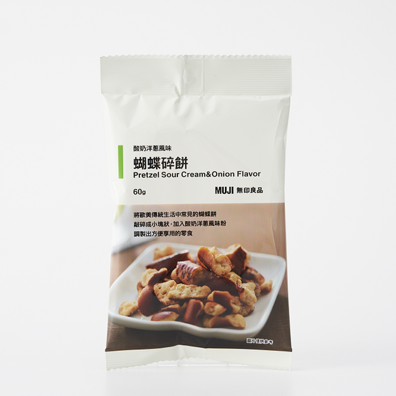 蝴蝶碎餅(切達起司、酸奶洋蔥、楓糖風味),49元 :將歐美傳統生活中常見的蝴蝶餅敲碎成小塊狀,加入各式風味粉,調製出方便享用的零食。