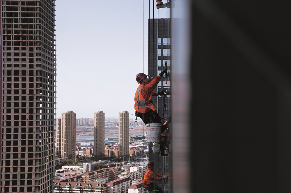 圖說:拍攝地點是中國天津,高樓的外牆清潔人員使用最基本的刮刀以及除塵撢進行掃除。人影宛如音符般反射在玻璃帷幕的倒影裡。