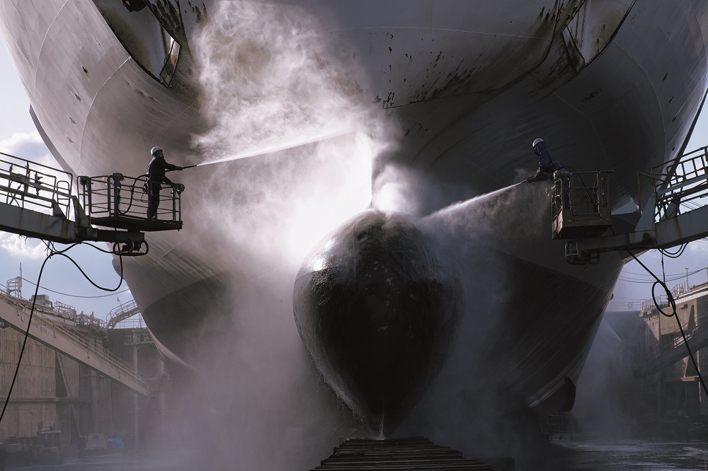 圖說:工作人員正以高壓清潔機器清洗船隻,將船移置船渠,一邊將航行時跑進船體內的海水排出,一邊以強力水柱把附著在船體上的垃圾、貝殼沖洗掉,如此一來,船在航行時才能更省力。