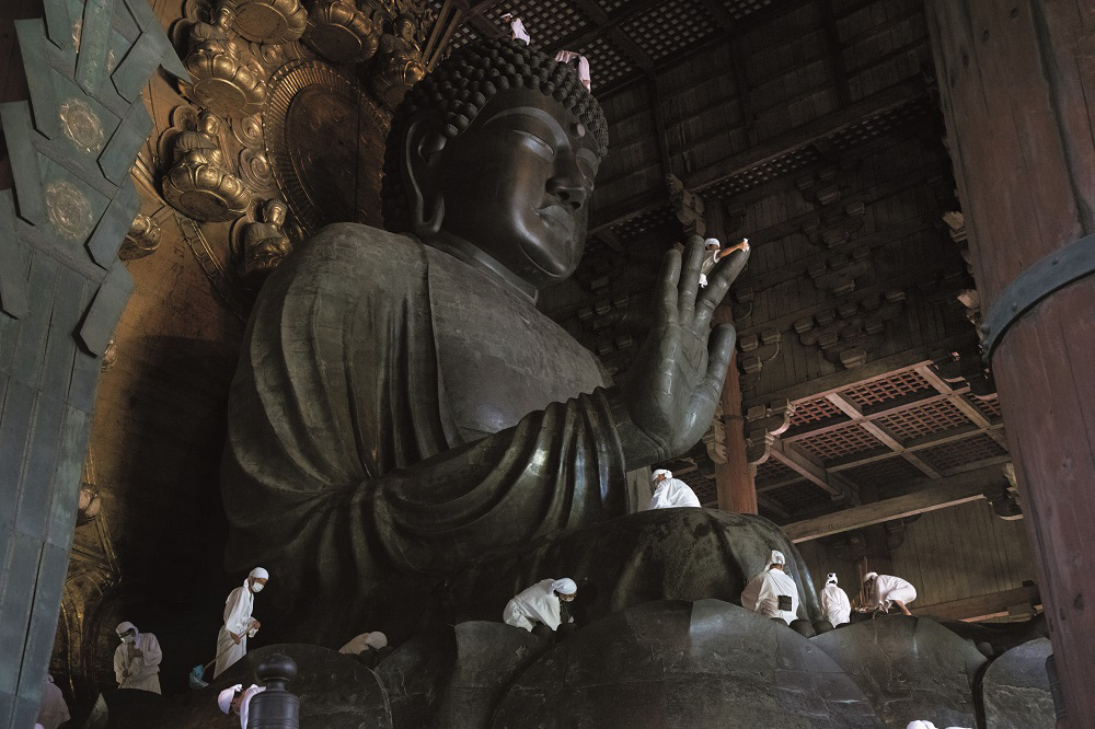 圖說:每年的8月7日,日本奈良東大寺的大佛,都會進行全身的大掃除。身著白衣的僧侶、信眾一早就於東大寺集合淨身,開始掃除,完成大佛的清潔後,相信心靈也會感到清淨吧。