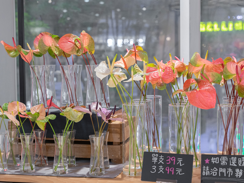 除了蔬果食品, MUJI無印良品實際走訪台南後發現,六甲地區火鶴花產量為全台南最大且出口量第一,主要外銷日本,且火鶴花培育過程採離地栽培,對土地的負擔相對較少,因此南紡門市希望與在地連結,首次引進花卉的販售服務,並趁著年末年始期間同步於全台22間指定門市提供預購「祝鶴」花禮盒,藉此串起顧客與農家,共享「以火鶴表祝賀」的創意與心意。
