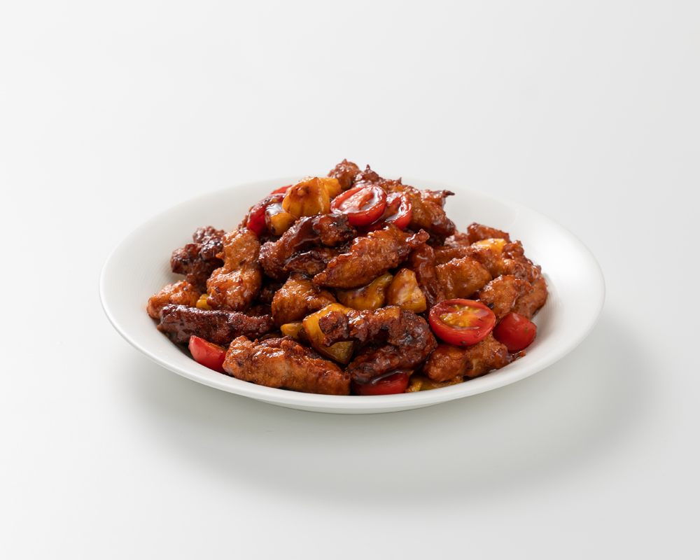 嚴選台灣香草豬的後腿肉,以鹽麴醃漬一天,搭配酸甜的醬汁及台灣小番茄與春蜜鳳梨。(豬肉產地:台灣。)