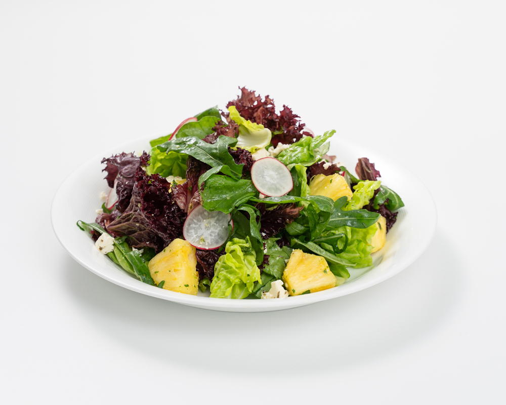 以三種香草做成香草醬汁,搭配春季盛產的台灣鳳梨及新鮮生菜。