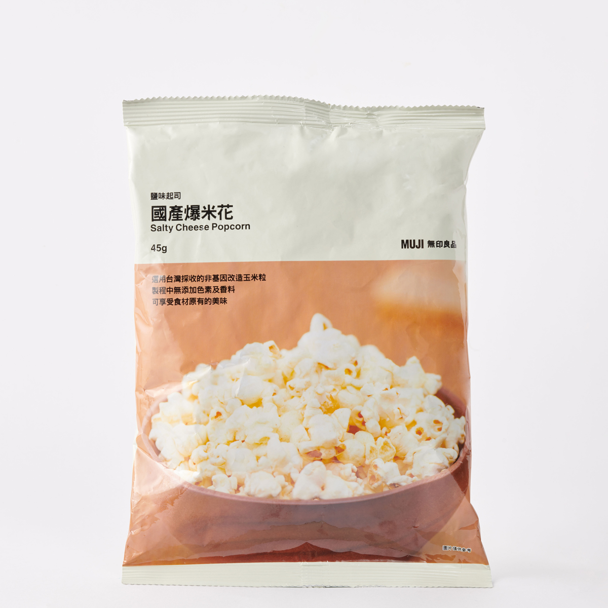 國產爆米花(鹽味起司),49元:選用台灣採收非基因改造玉米粒,製程中無添加色素及香料,可享受食材原有的美味。