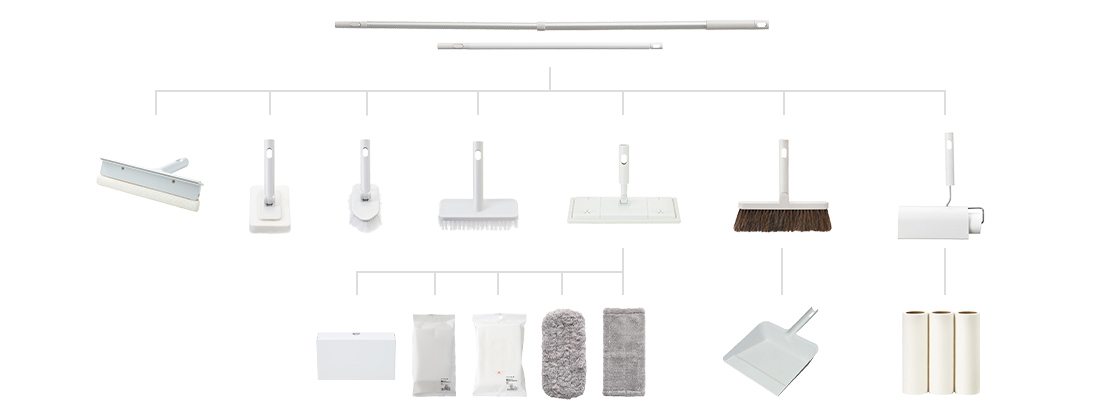 像是清掃地面時,可使用地板除塵拖把搭配除塵拖把布,利用微纖毛易於吸附髒污的特性進行大範圍除塵。在汙漬殘留的區域,再更換為吸水拖把布濕擦即可。整理地毯、床鋪及衣物等布製品時,地毯清潔滾輪可輕鬆黏除棉絮及毛髮。若想要去除浴室潮濕的霉垢與水痕,浴室用刷可輕鬆出力,刷除磁磚縫隙髒污,而玻璃、鏡子等光滑表面,則推薦清潔刮把先用海綿清潔後,再用另一側的刮刀去除水分,令視覺光亮如新。更進一步,針對連手指都難以深入的縫隙,則可利用廣受顧客好評的縫隙清潔系列,針對不同的細部做重點清潔。