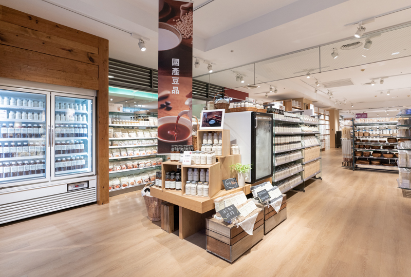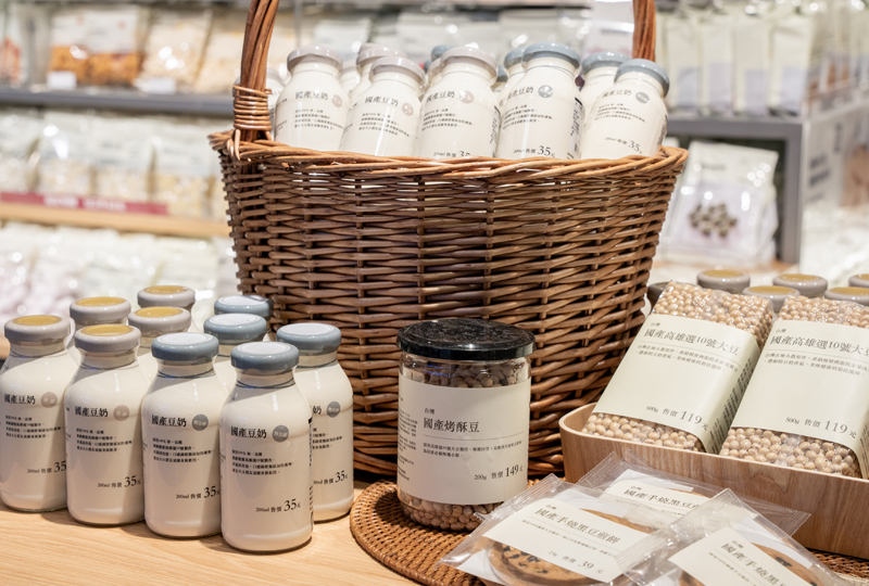 在商品面上,MUJI無印良品比漾門市期望以傳遞在地物產為概念,規劃了食農專區。而永和地區向來以豆漿聞名,因此我們特別開發採用產銷履歷大豆製作的多樣豆類產品,在比漾門市全台獨家領先販售,希望支持地產地銷,也讓更多顧客認識台灣產大豆製品的優質口感。以本次開發的豆奶來說,採用100%單一品種高雄選10號大豆製作的無加糖與微糖豆奶,經產銷履歷驗證,非基因改造,更通過SGS農藥零殘留等各項檢測,不添加防腐劑,是補充植物性蛋白質的最佳推薦。而台灣料理絕不可少的醬油,我們選用了以傳統甕缸釀造技術製成手工純釀黑豆醬油,嚴選產銷履歷台南五號黑豆為原料,即使對麩質過敏者,亦可安心食用。其他還有手工日曬豆腐乳、烤豆酥與履歷手燒黑豆煎餅等,總計近20項台灣產豆製品,邀請顧客一同品嚐台灣特有的風土美味。