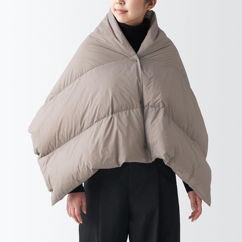 輕量澳洲羽絨可攜式披肩,1,100元:使用膨脹係數達 750FP 的羽絨。可披上肩、膝上使用或圍在腰上等各種場合。