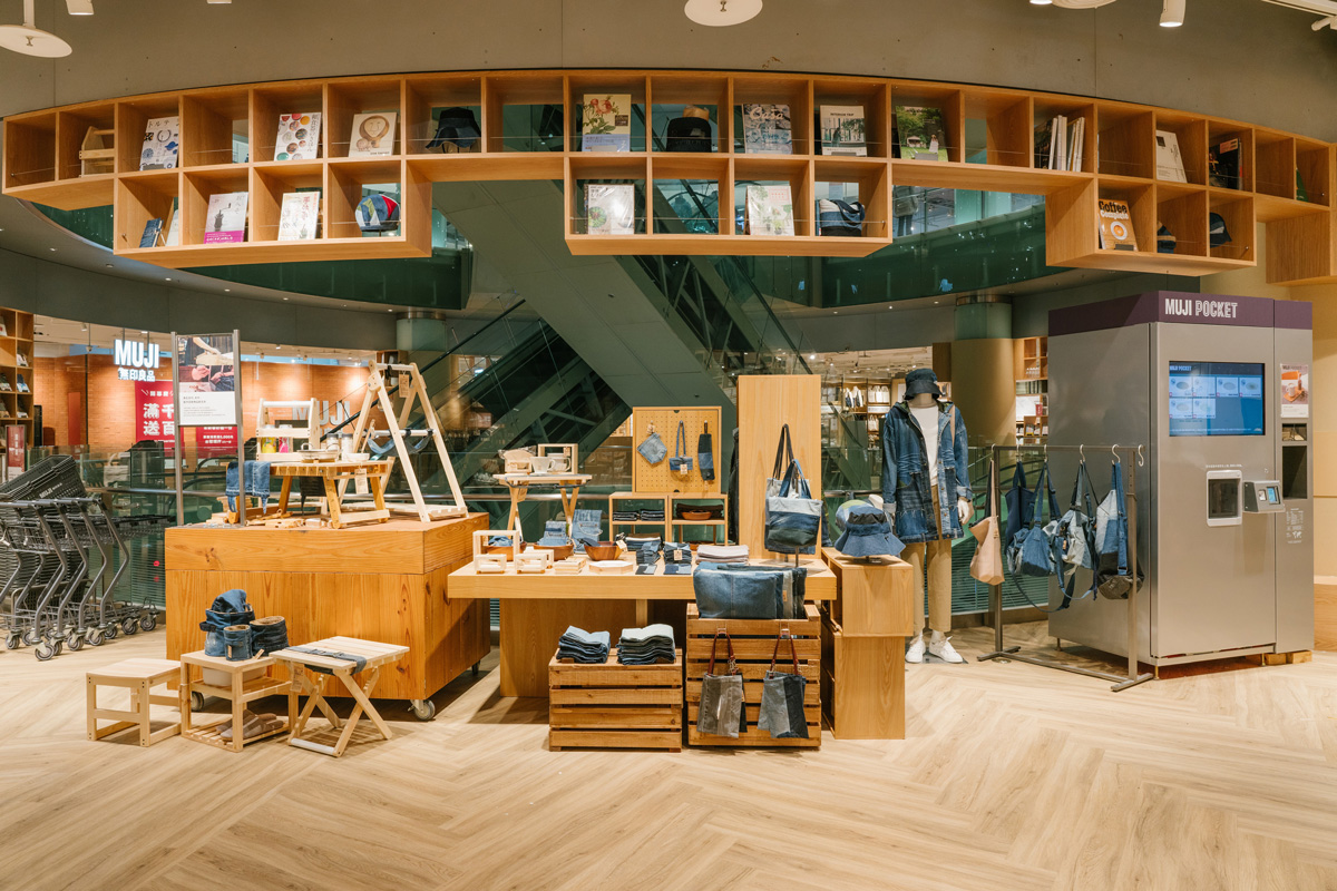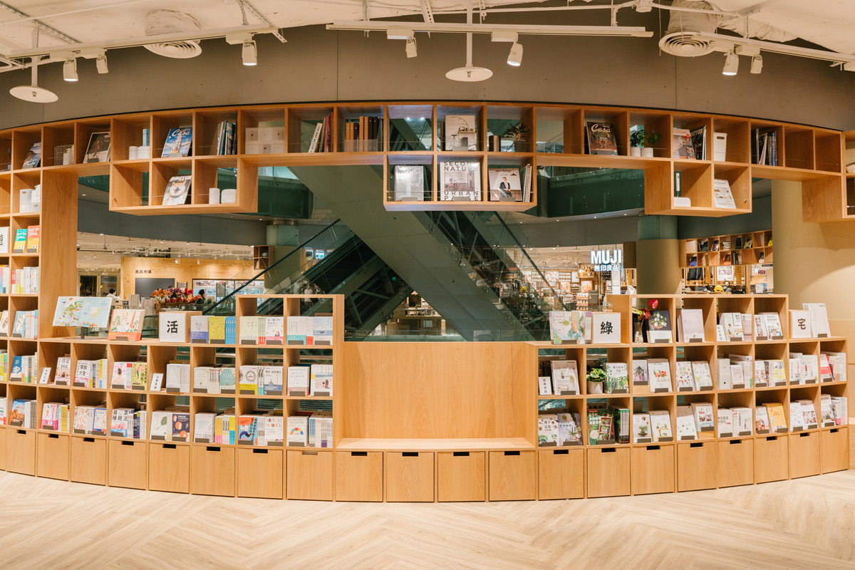 MUJI無印良品希望透過書與文字,提供生活各面向的思考。現場除了以基本生活需求的食衣住行育樂選書之外,更以「聯合國永續發展目標SDGs」為主軸,進行書籍推薦。並運用現場的環形空間設計,將書架以立地與吊掛形式陳列,提供近5,000本書籍。在童裝區也特地設置童書專區,並採用階梯設計方便休憩與閱讀,舒適自在的氛圍讓爸媽和小孩都能在此放鬆閱讀。