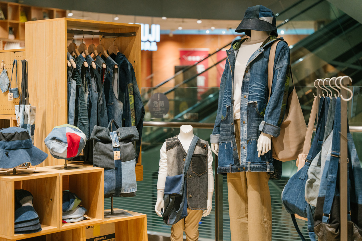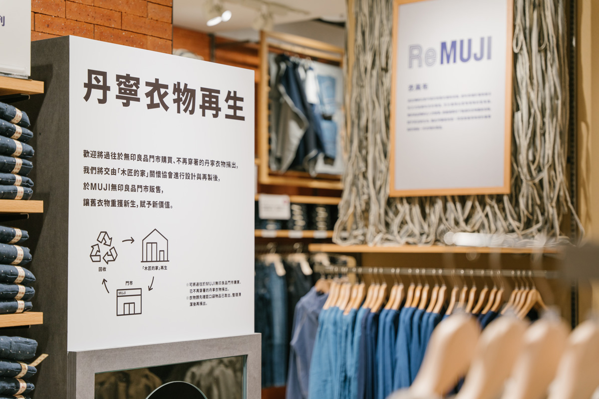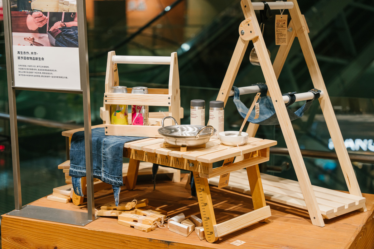 為實現「對社會有所貢獻」的品牌理念,MUJI無印良品美麗華旗艦店除了設置「丹寧衣物再生箱」與「玻璃再生箱」外,也提供食物共享服務,邀請民眾分享家中仍在效期內且包裝完整的食品,並攜手「西湖日照中心」轉贈給社區內需要的家庭作為日常飲食及日照長者的生活功能訓練,達到惜食與分享的社區共好理念。在丹寧衣物再生的部分,攜手「木匠的家」關懷協會設計並開發一系列生活器具,像是可提野餐小桌、丹寧拼接小坐墊及木製三角架等等,都是利用回收木材與二手丹寧布料再製而成,MUJI無印良品希望民眾在購買新品的同時也不忘舊物的美好。