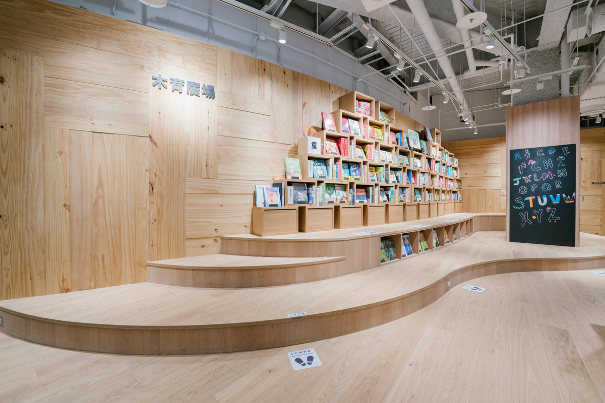 「木育廣場」採階梯設計,方便乘坐休憩與閱讀,溫和舒適的氛圍讓家長和小孩都能在此放鬆。