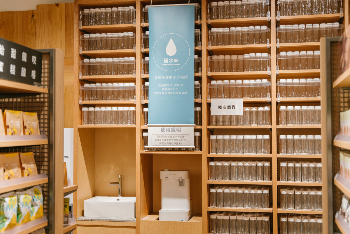 MUJI無印良品美麗華旗艦店領先全台,設置免費的飲用水提供站,提供過濾飲用水,讓顧客可以直接裝取。同時也設計推出限定款玻璃水瓶,大瓶口的設計及250ml的容量,容易清潔且便於攜帶,可減少一次性容器的使用。