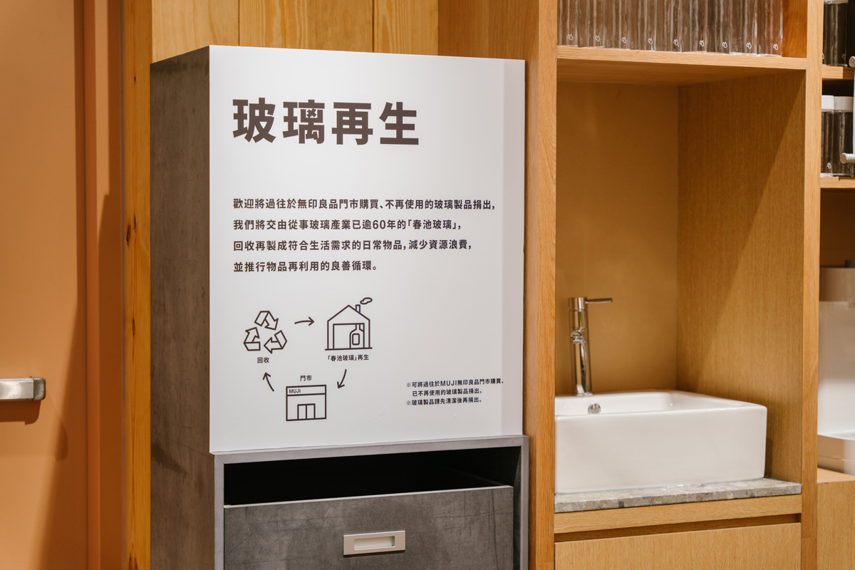 玻璃是100%可回收再製的素材,MUJI無印良品秉持商品開發中「選擇素材」的理念,攜手「春池玻璃|春室」在美麗華旗艦店打造全台獨家的玻璃工坊,提供玻璃DIY體驗並設置玻璃回收服務,希望與顧客一同支持循環經濟並了解傳統工藝的美好。未來美麗華旗艦店也將販售更多以玻璃為素材設計的生活用品,希望滿足顧客生活所需的同時,實踐資源循環的永續社會。