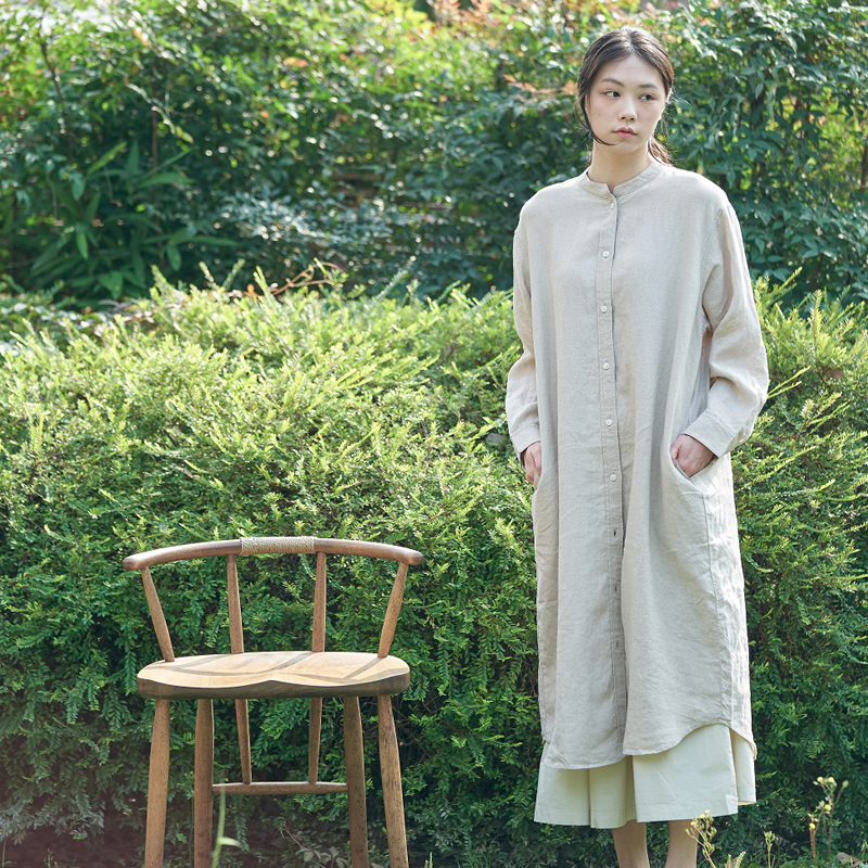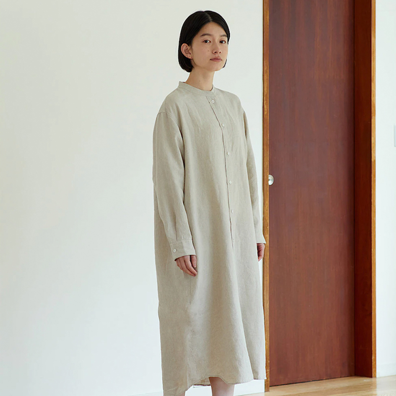 女法國亞麻水洗立領洋裝,1,390元:將法國亞麻的質地完整呈現,經水洗加工,觸感更加柔軟舒適。親和肌膚,穿著感舒適是其特點。