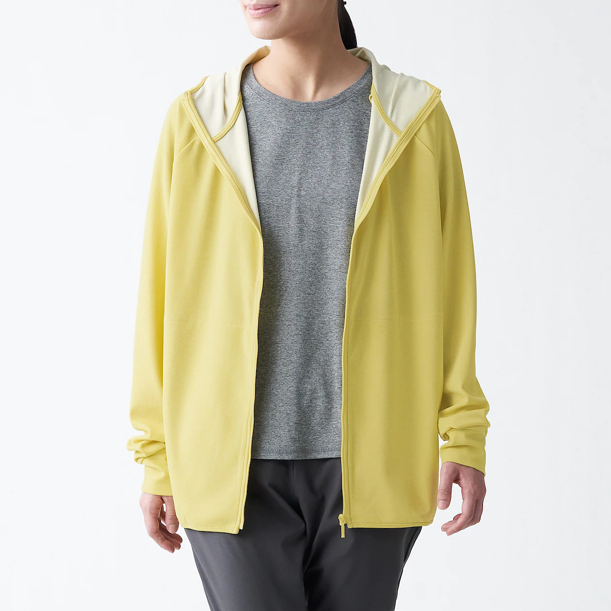 抗UV聚酯纖維拉鍊連帽外套,599元:【男女適用】採用觸感柔軟、具有適度伸縮性的聚酯纖維織線,製作出具速乾效果的連帽外套。