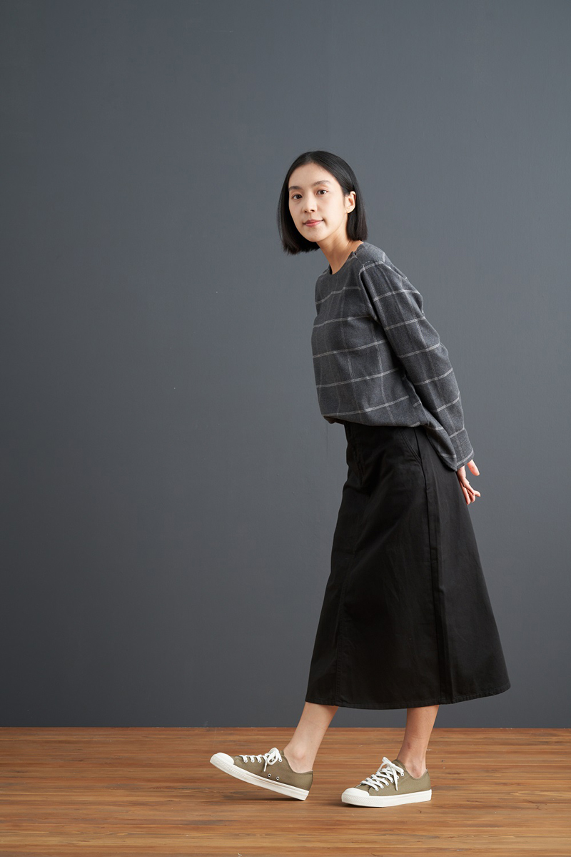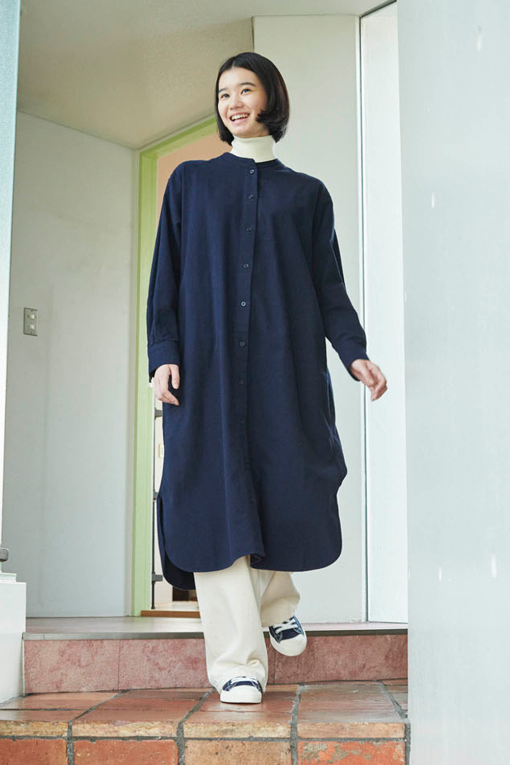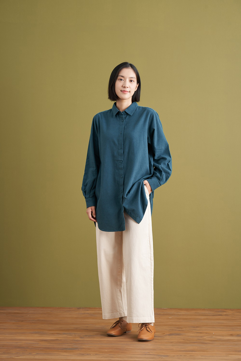 搭配重點:利用深淺配色,營造令人眼睛一亮的風格。長版衫的設計搭配褲裝,營造舒適自在的穿著感同時堆疊出穿搭的層次。