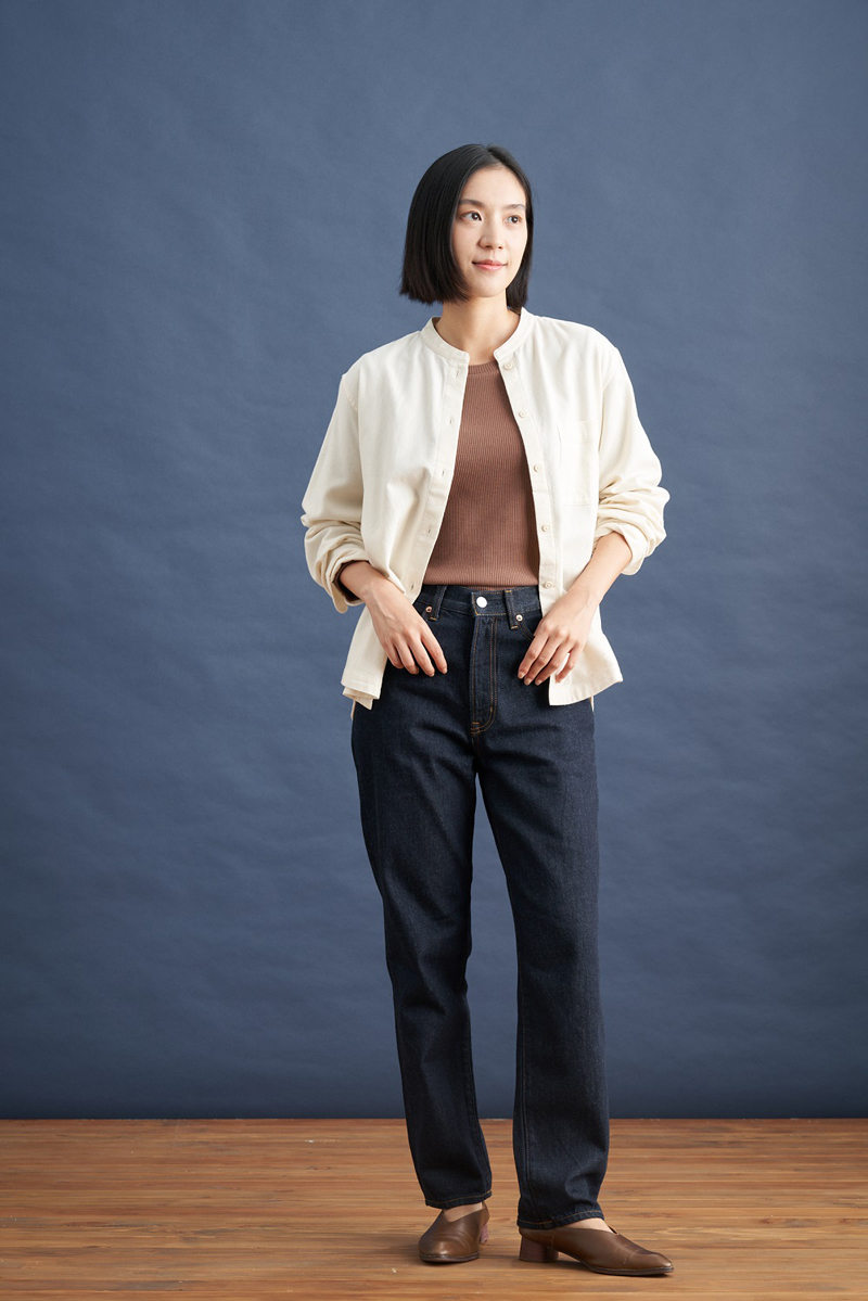 搭配重點:溫潤的磚紅色T恤搭配原色法蘭絨立領襯衫,提升柔和的形象。略顯寬鬆的直筒褲展現舒適輕鬆的氛圍。