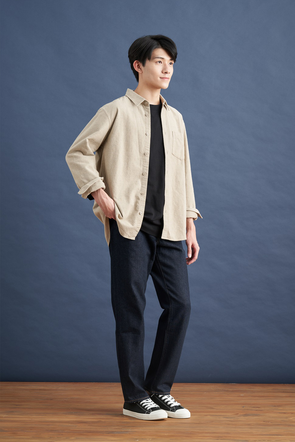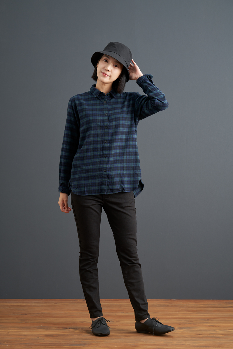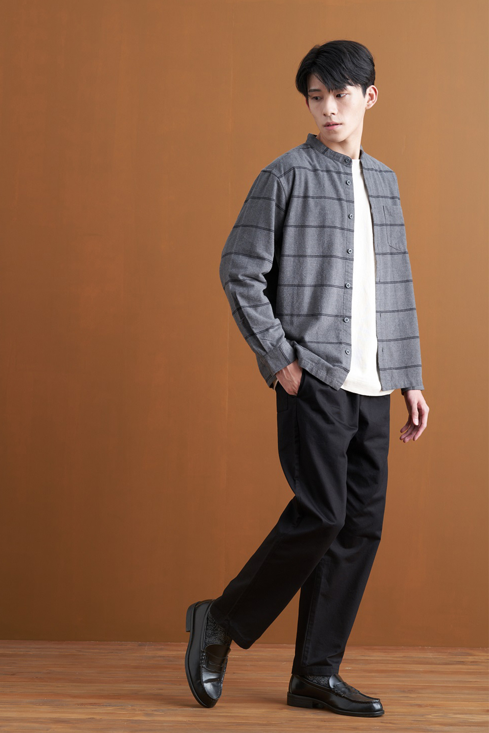 搭配重點:質地柔軟的法蘭絨襯衫在初秋時可當作薄外套穿著,穿搭上可利用有領設計的襯衫內搭T恤做出多層次的變化。