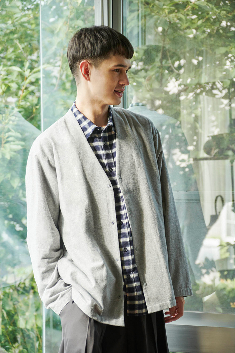 搭配重點:運用2種以上相同素材或顏色的單品作為搭配,以同樣為法蘭絨的襯衫與開襟衫相互搭配,讓整體造型更加統一。