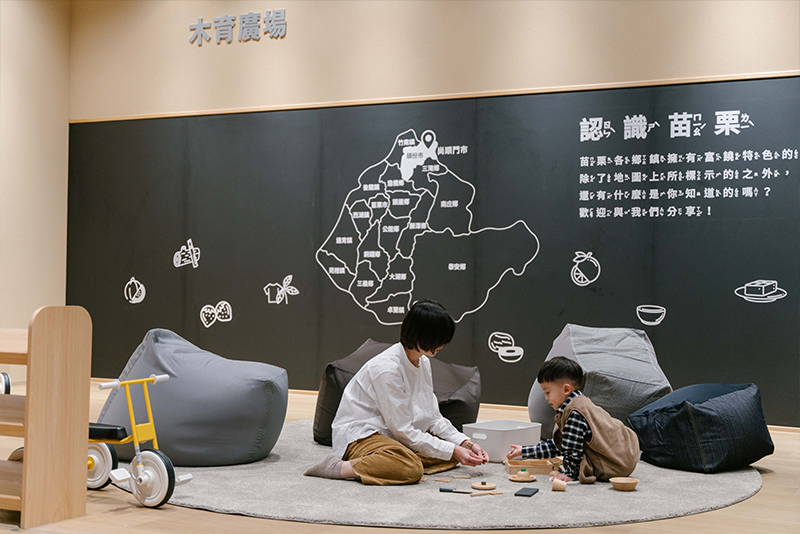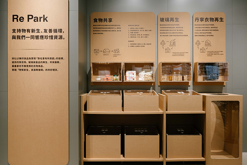由於鄰近尚順育樂世界,MUJI無印良品考量家庭客層的需求,特別規劃10坪的「木育廣場」,除了提供木製玩具外,也放置各式童書繪本。同時在牆面設置大型黑板,繪製了苗栗各區域的地理位置及物產介紹,希望讓孩子增添對在地的認同。門市也提供「交換繪本」及「Re Park」服務,秉持友善環境、共享資源的想法:「交換繪本」服務邀請小朋友將家中不再閱讀的舊有繪本捐出,每提供兩本即可換得一本現場繪本,希望延長書籍的使用生命,並教育孩子分享的重要性。而「Re Park」服務則是設置「丹寧衣物再生箱」、「玻璃再生箱」與「食物共享服務」,邀請民眾分享家中仍在效期內且包裝完整的食品,透過合作「家扶基金會苗栗家扶中心」轉贈給需要的家庭,達到惜食與分享的共好理念。在丹寧衣物與玻璃再生的部分,則攜手「木匠的家」關懷協會與「春池玻璃|春室」將可用資源經過職人設計與巧思後,重新製作為嶄新商品,實踐循環經濟的同時,也與民眾共同實踐惜物愛物的善意。