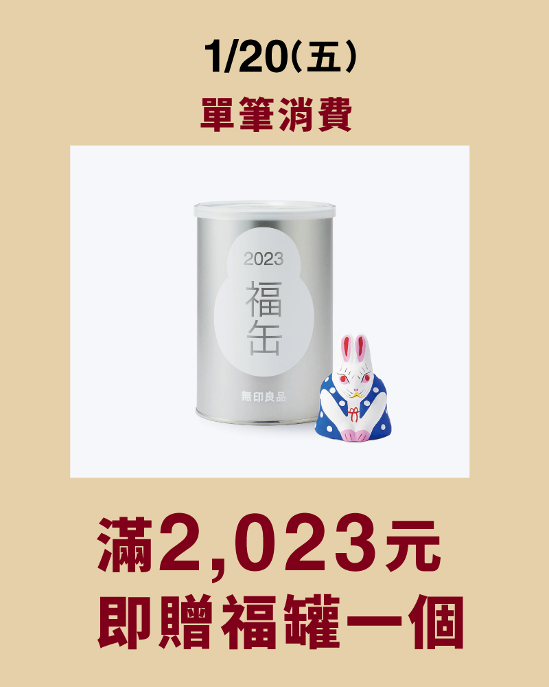1/20(五)限定,單筆消費滿2,023元贈2023年限量福罐乙個。 (只送不賣,每人限贈乙個,恕不累贈亦無法指定款式。)