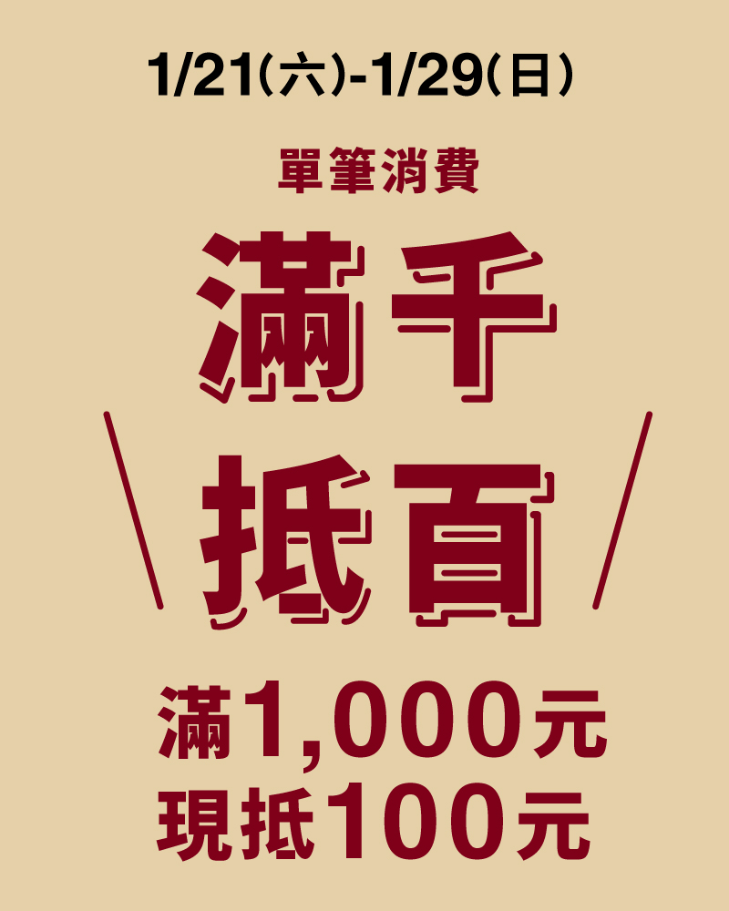 1/21(六)-1/29(日),消費滿1,000元現抵100元。