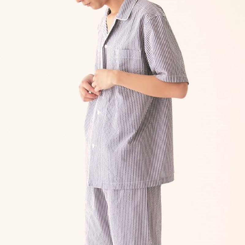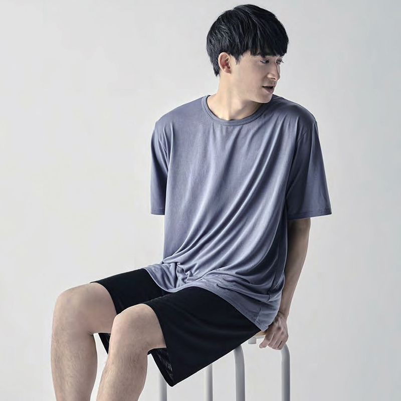 男無側縫泡泡紗短袖家居服(預計4月上市)講究穿著時的舒適度,清爽舒適的穿著感是其特點。售價1,190元。