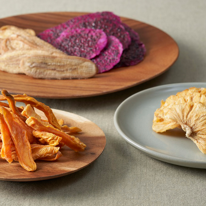 台灣富有水果王國的美譽,盛產各種高甜度的水果,果乾系列即是挑選台灣優質農產品製作。像是蜜蕉果乾、金鑽鳳梨果乾、愛文芒果乾與紅龍果乾。製程上是以長時間的低溫乾燥將美味濃縮,無添加糖,品嚐果肉的原始滋味。預計售價179元起。