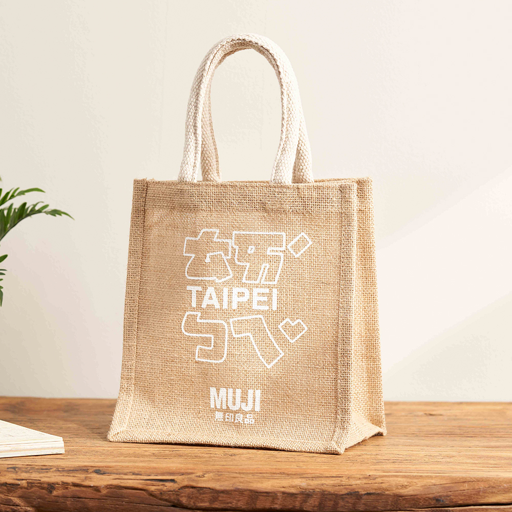 MUJI無印良品的黃麻購物袋以其耐用的材質與平實的價格,成為許多顧客的愛用品。MUJI無印良品松高旗艦店特別使用英文與注音符號的排列組合作為台北文字的設計,售價69元,限量販售。