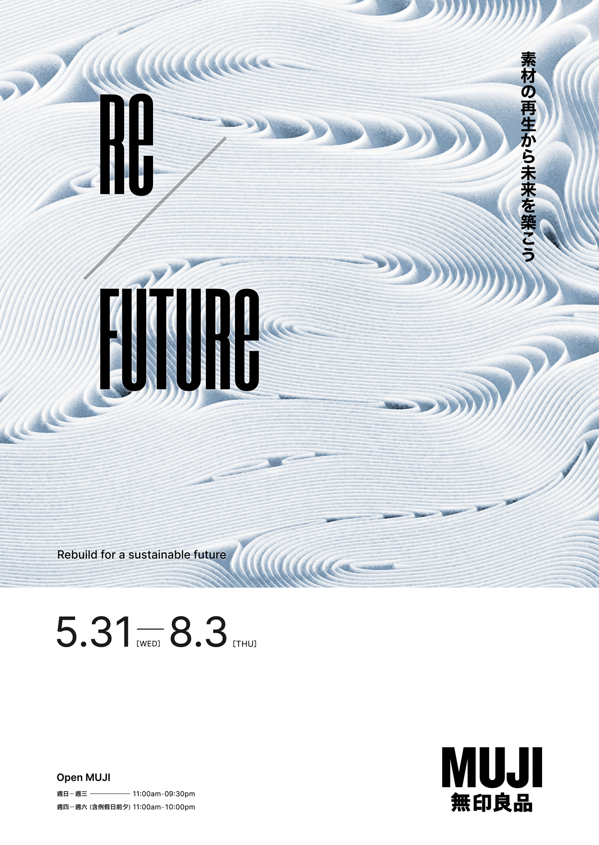 這次的松高旗艦店,也是MUJI無印良品首次在台灣獨立企畫關於友善環境與再生主題的展覽,特地規劃12坪的空間,以「Re/FUTURE」為題,陳列MUJI無印良品正在進行回收與再生的各類物件,包含玻璃、塑膠、廢輪胎、丹寧褲、植林木及物流紙箱,讓顧客了解我們一直為環境友善所做的努力,同時也邀請顧客與我們一起為環境付出行動,與MUJI無印良品共同實踐永續未來。