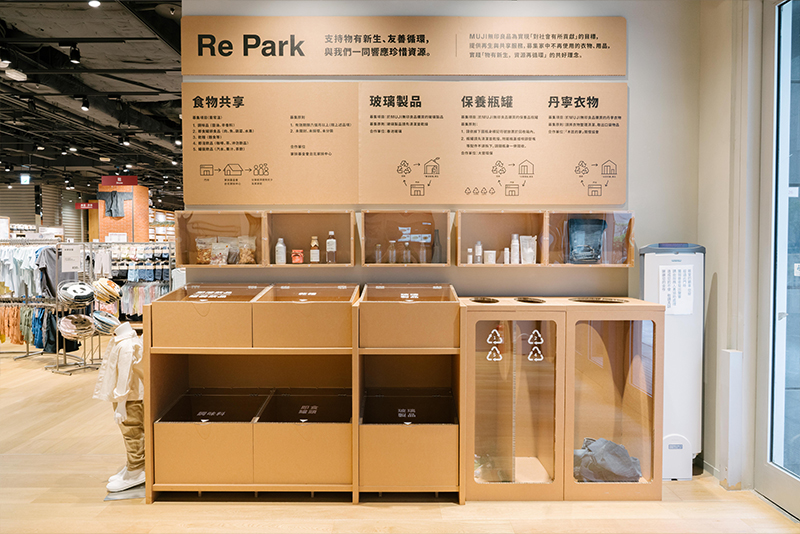 MUJI無印良品松高旗艦店開幕即呼應「友善環境及永續」理念,展開「Re Park」服務,設置「丹寧衣物再生箱」、「玻璃再生箱」、「食物共享服務」與「保養瓶罐再生箱」,邀請民眾透過回收的簡單動作,實踐永續循環的未來。