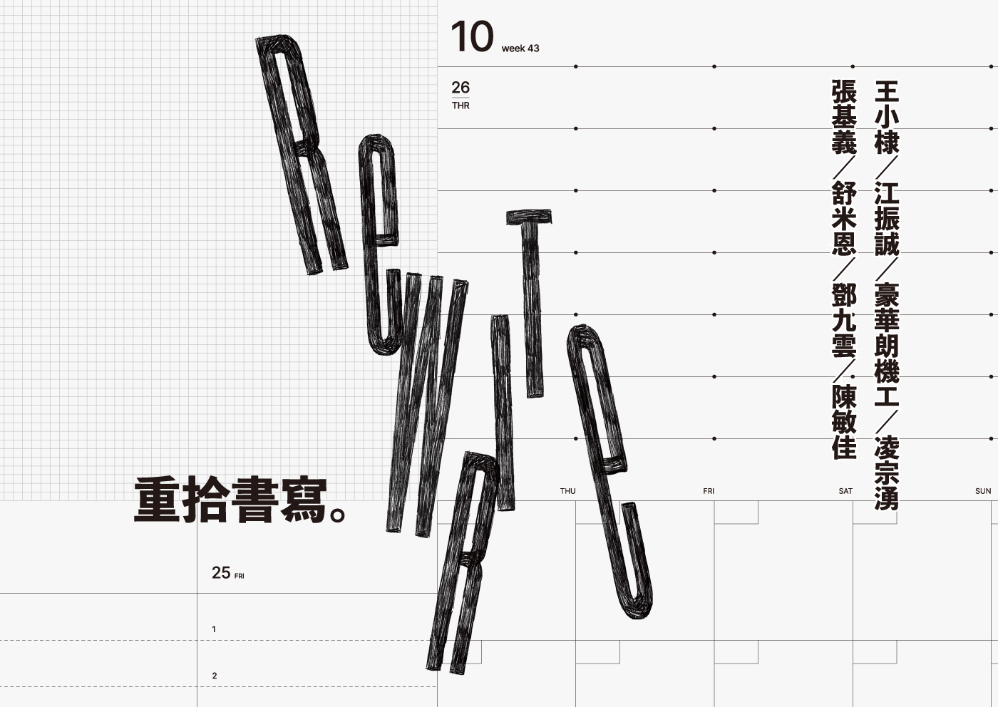 MUJI無印良品為喚起民眾對書寫的記憶,特別以「Re WRITe重拾書寫」為主題,邀請8位不同領域的創作者,包含花藝、劇作、音樂及料理等知名職人與我們分享日常書寫與塗鴉的筆記本,藉由創作者們的手寫文字,記錄下對生活、對工作以及心情紀實的筆記,字跡或隨興、或嚴謹,讓觀者的心情也被創作者當下的意念渲染,再透過一字一句,跳出紙張,成為具體之物,可能是一本書、一部劇本、一份料理、一首歌曲或一束花藝等。