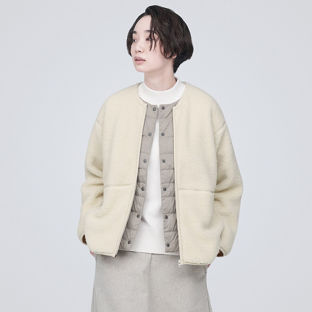 MUJI無印良品選用膨脹係數達750FP並使用特定飼養和取毛方式的優質羽絨。利用生產過程中的剩餘紗線,製成再生尼龍布料。考量攜帶方便,兩側口袋即是收納袋,簡單摺疊後即可輕便攜帶。今年內裏增添可以避免靜電積聚的導電紗,減少靜電產生。售價1,190-2,790元。
