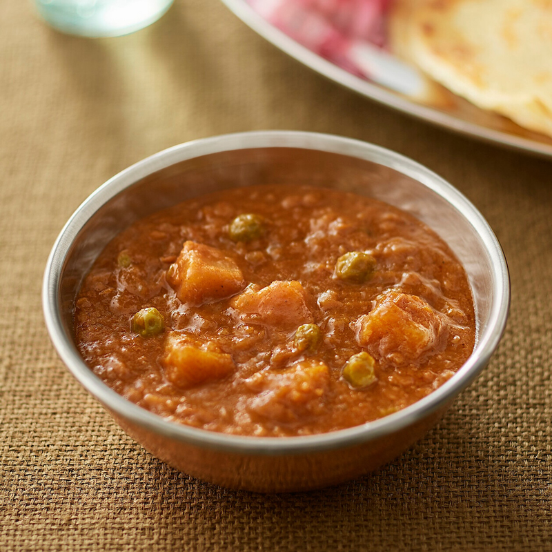 異國咖哩速食包 蔬食馬鈴薯青豆,110元:以北印度蔬食咖哩為範本,將馬鈴薯與青豆加入具有孜然、馬薩拉香氣的醬汁中,呈現蔬菜鮮甜與香料味十足的咖哩。推薦搭配白米或雜穀米。(不使用肉、蛋,植物五辛素)