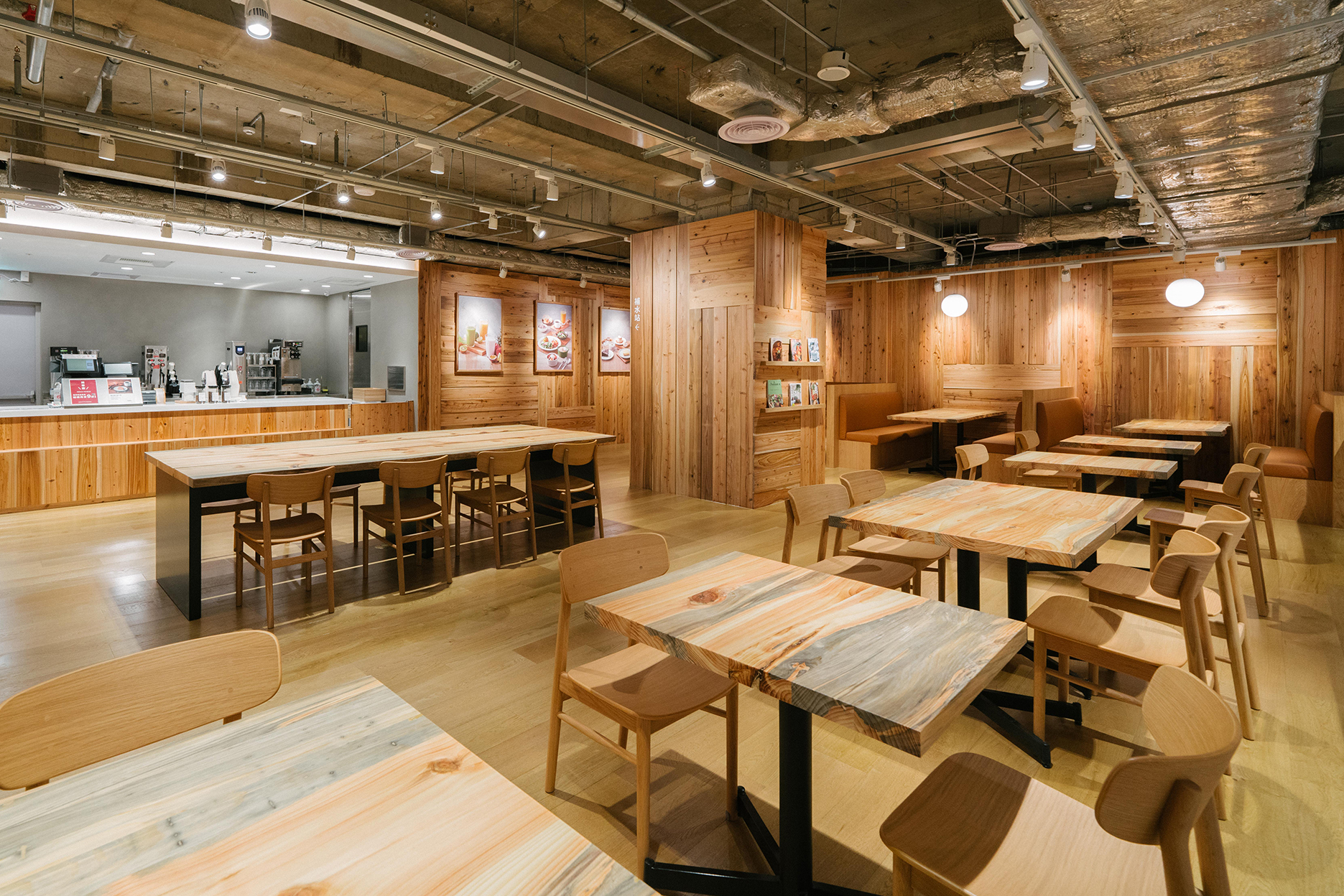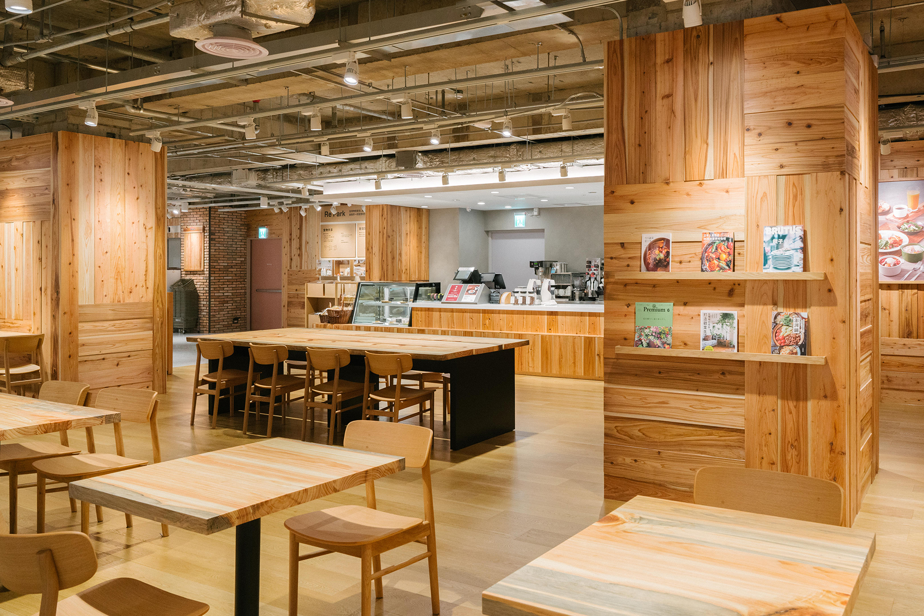 2F提供餐飲料理與生活雜貨用品,因此使用較具居家溫馨意象的國產木材與回收紅磚等素材為主進行裝潢,像是牆面是取用國產「間伐材1」 ,而餐廳的餐桌板則採用來自大雪山上的「枯危木2 」,以不砍伐新木材為理念,實踐珍惜資源與善待山林的作為。