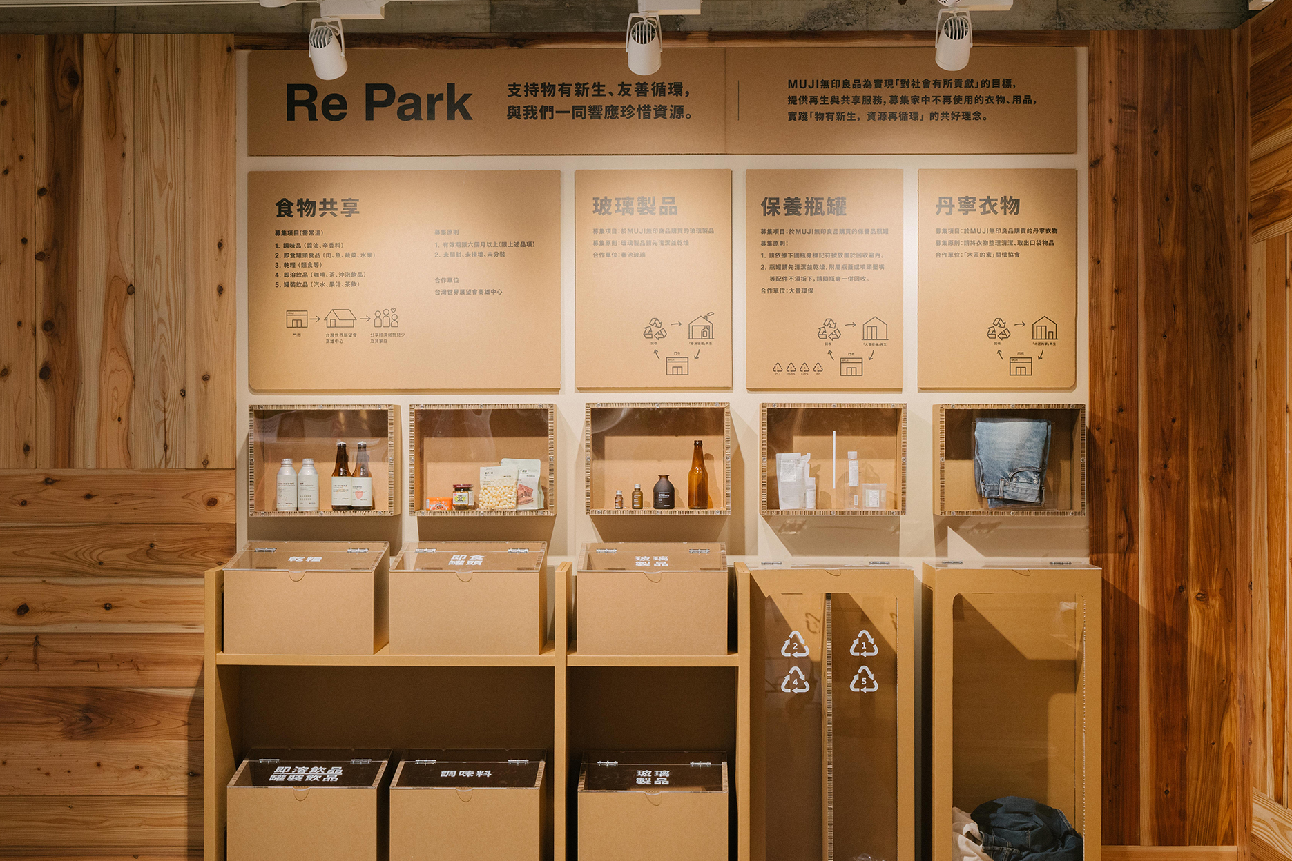 MUJI無印良品大立旗艦店開幕即呼應「友善環境及永續」理念,展開「Re Park」回收再生服務,設置「丹寧衣物再生箱」、「玻璃再生箱」、「食物共享服務」與「保養瓶罐再生箱」,邀請民眾透過回收的簡單動作,實踐永續循環的未來。