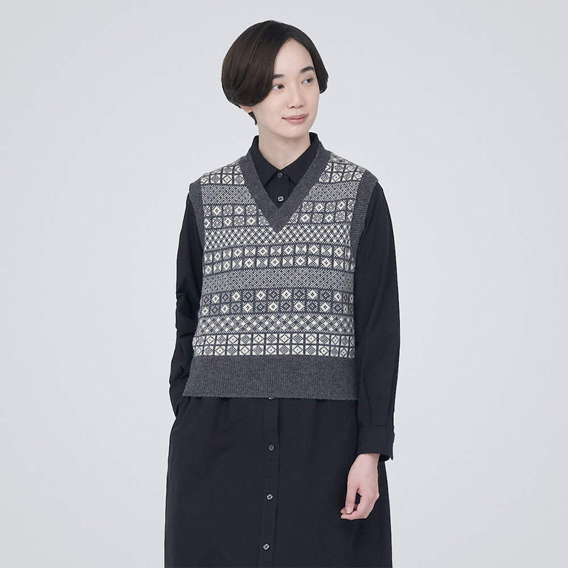 女美麗諾羊毛緹花織紋V領背心
