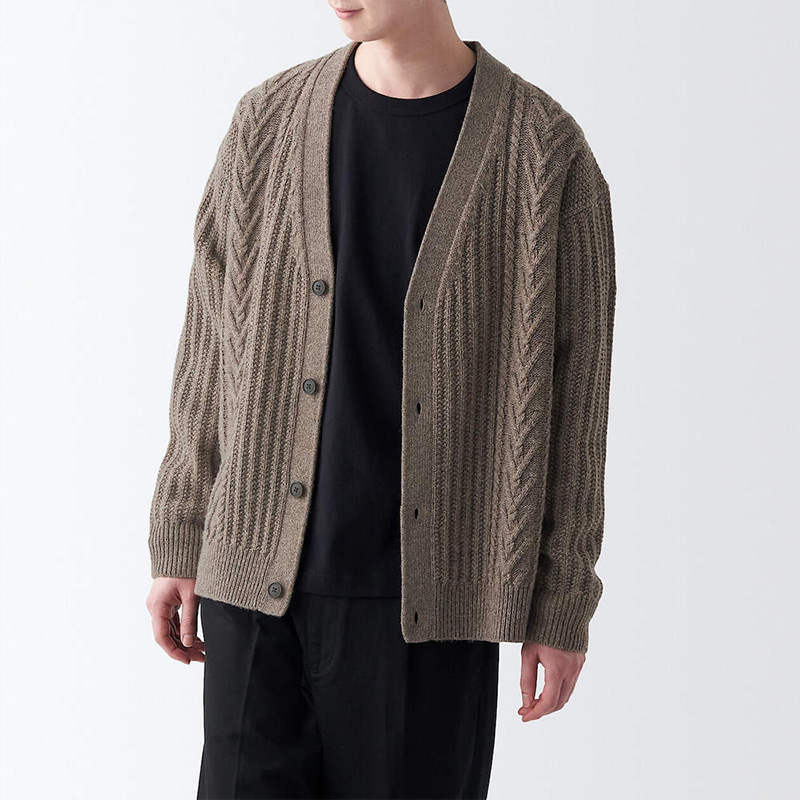 男美麗諾羊毛麻花織紋V領開襟衫