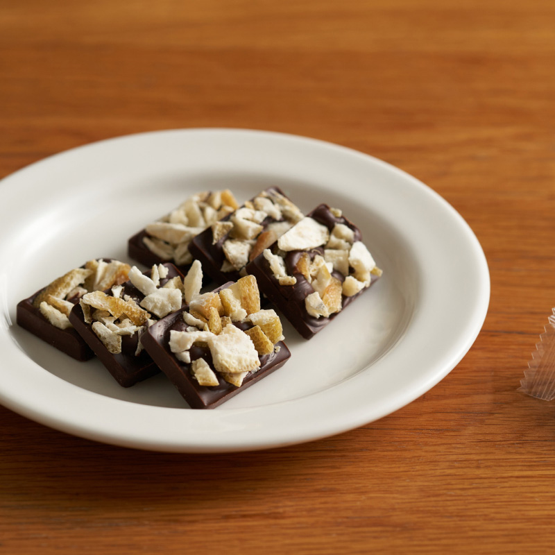 文旦柚皮果乾巧克力,139元:將酸香清爽的麻豆文旦柚皮低溫烘製成果乾點綴於苦甜72%黑巧克力上,巧妙融合果乾纖維與巧克力絲滑口感。