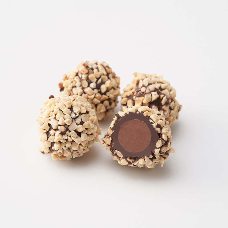 夾心 榛果醬巧克力,119元:覆蓋杏仁碎的巧克力包裹著香甜滑順榛果內餡,層次溫醇雅緻。