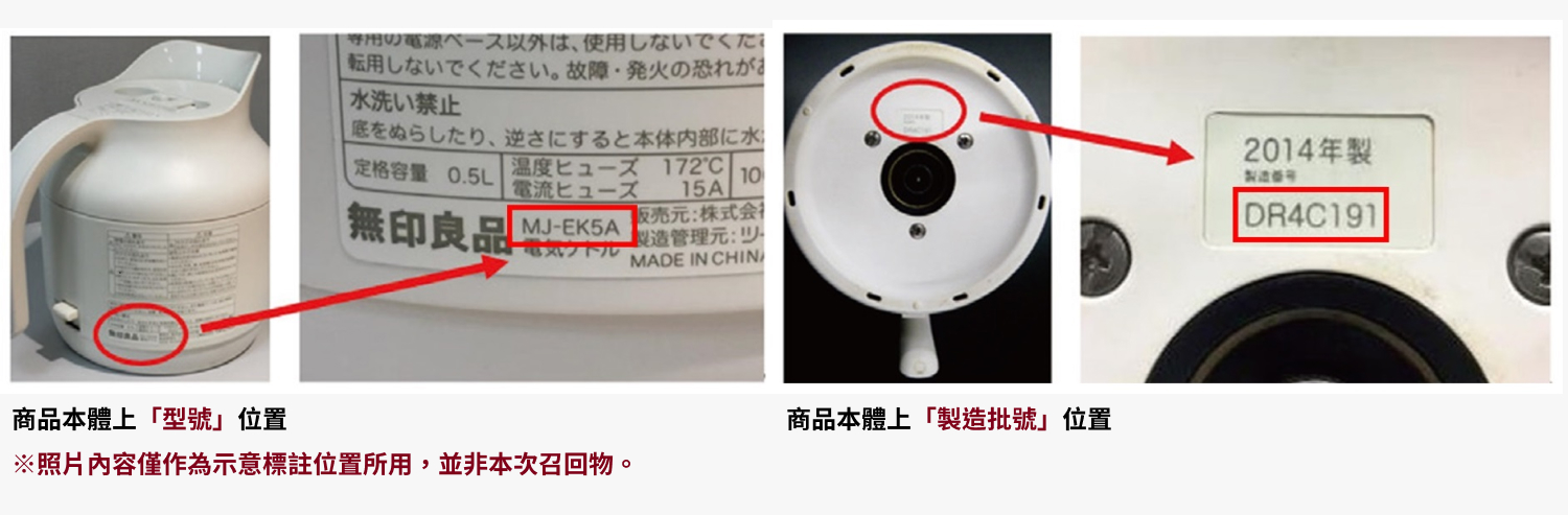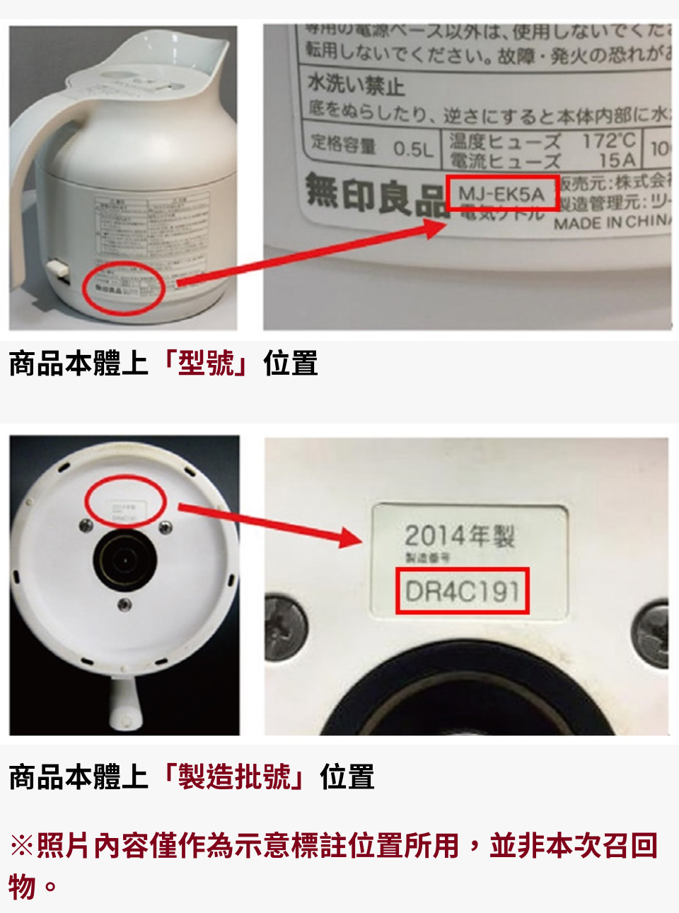 感謝您對MUJI無印良品的支持與愛用,近期本公司接獲原產地國委製商通知:以下所公告之「電熱水壺」商品型號及製造批號,因有結構安全性之疑慮,基於企業社會責任及保障顧客之安心安全考量,本公司將進行預防性自主回收作業。