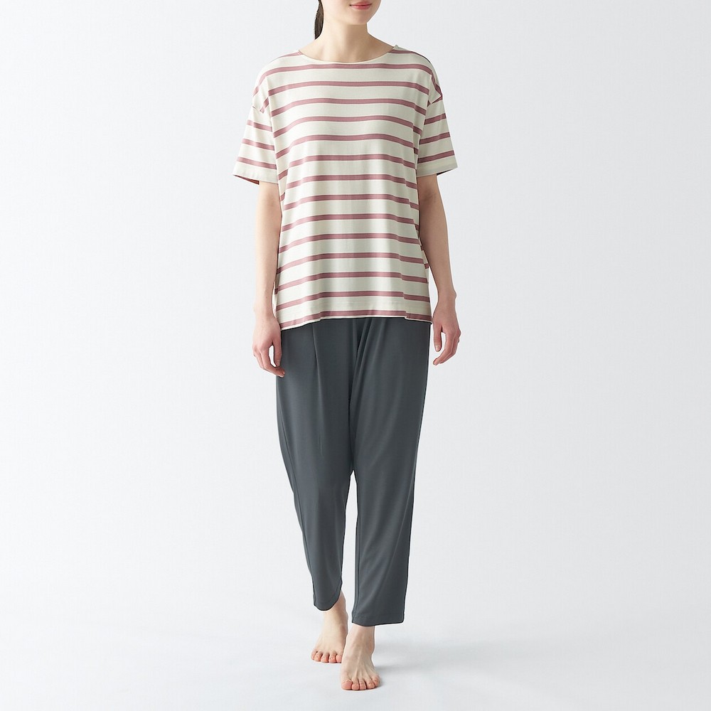 - 涼感短袖家居睡衣:以嫘縈與聚酯纖維混紡製成柔順垂墜感。肌膚觸感柔滑為其特色。上衣為經典條紋款式,褲子為簡約素色。