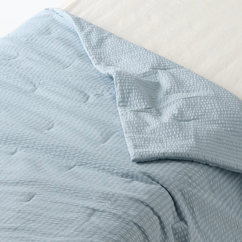 縱向凹凸織法減少與肌膚接觸面積,使用上清涼舒適,除了有床包及枕套的組合外,今年也推薦適合夏季使用的薄被。售價250-1,590元。 - 柔舒水洗棉