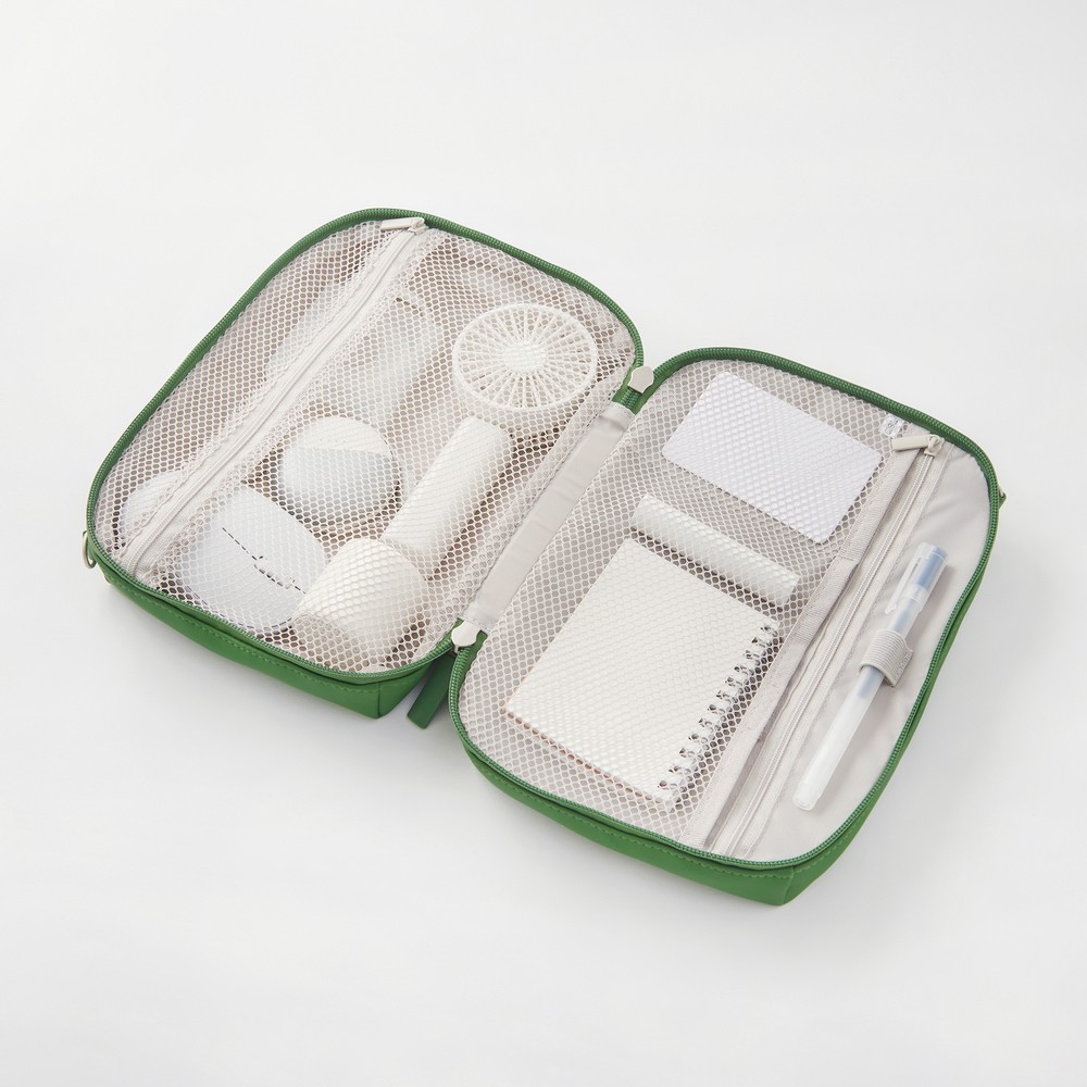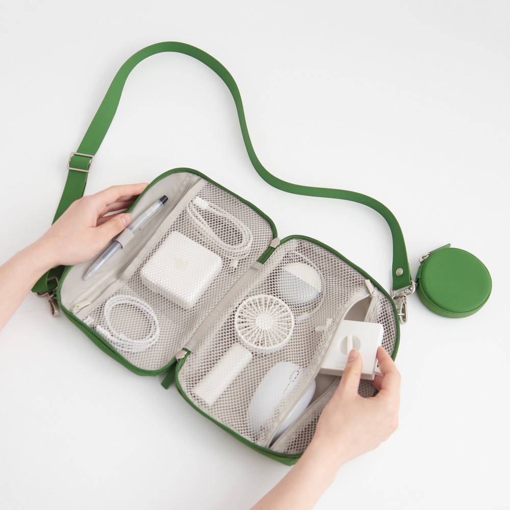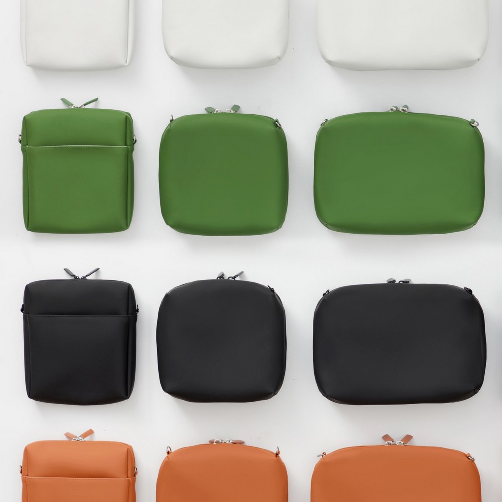 採用PU材質,手感柔軟舒適,不易沾水。附有扣環,可搭配掛繩組合不同的收納包外出使用。今年春夏將新增3款收納包,並提供綠色款式為期間限定色販售,數量有限,售完為止。售價150-650元。