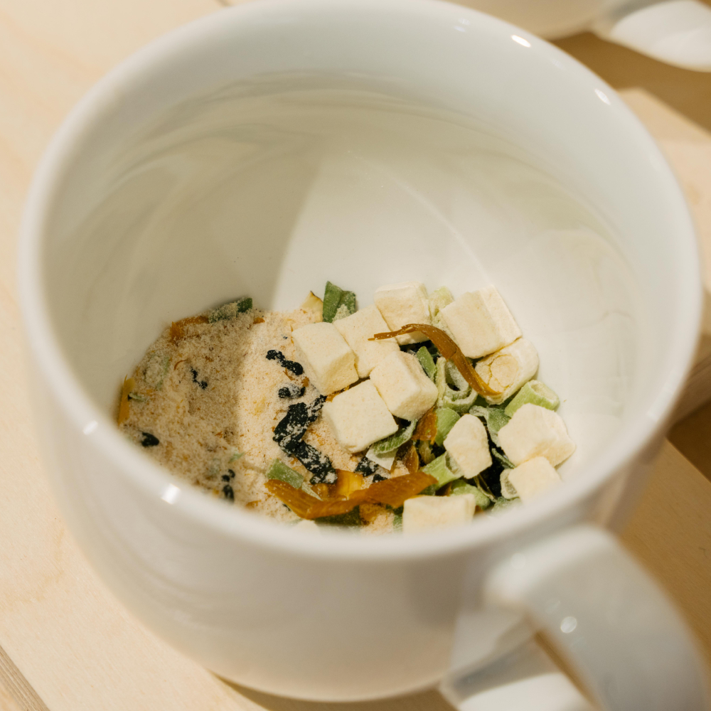 在忙碌的生活型態下,為協助顧客快速方便地完成一道湯品,MUJI無印良品新上市四款沖泡湯系列,強調僅需加入熱水,即可品嚐豐富蔬菜、風味香醇的湯品,不僅暖心暖胃更可攝取纖維。口味包含:海帶芽、味噌豆腐、番茄蔬菜與毛豆玉米濃湯。售價99元。