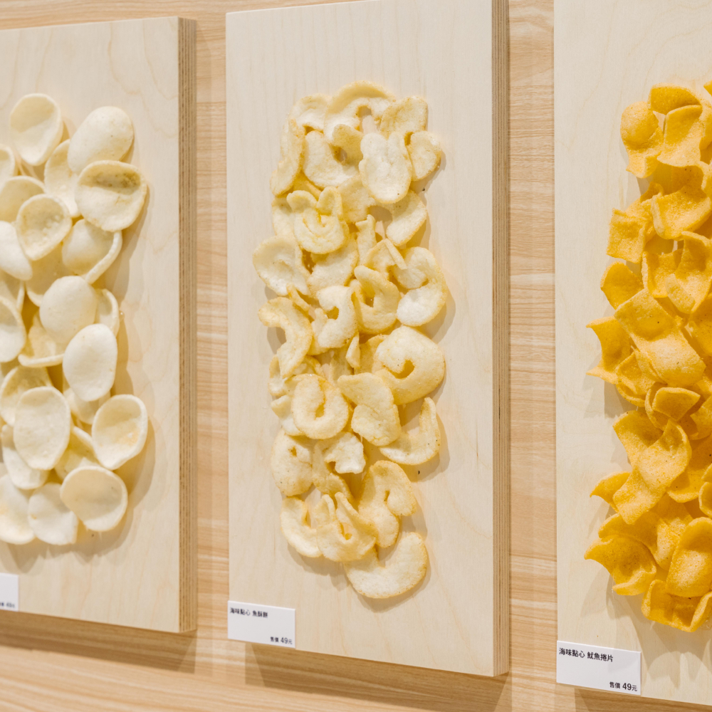 由台灣開發生產,將魚、蝦、魷魚等海味食材,製作成鮮味十足的點心。售價49元。