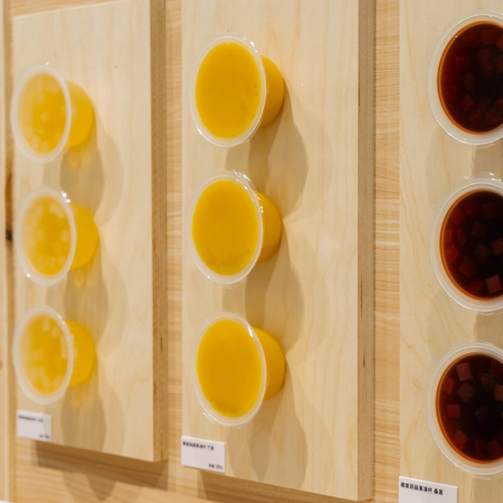 蒟蒻果凍與椰果,水果風味清爽、口感Q彈。口味包含:桑葚、白柚、芒果,售價39元。