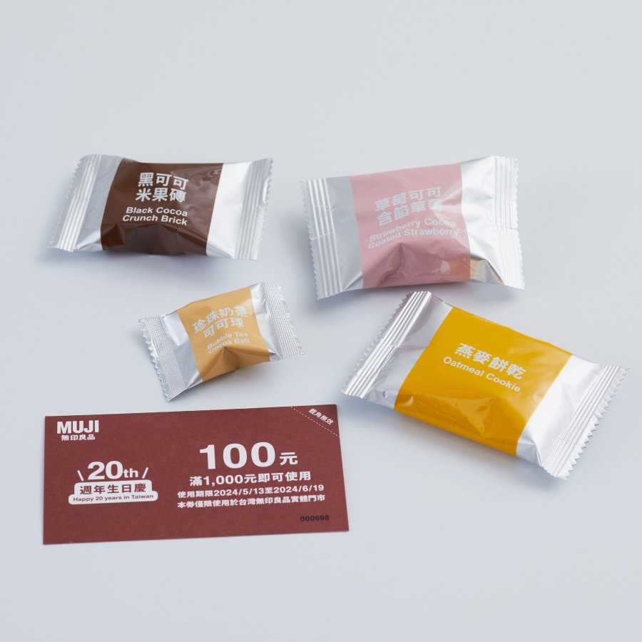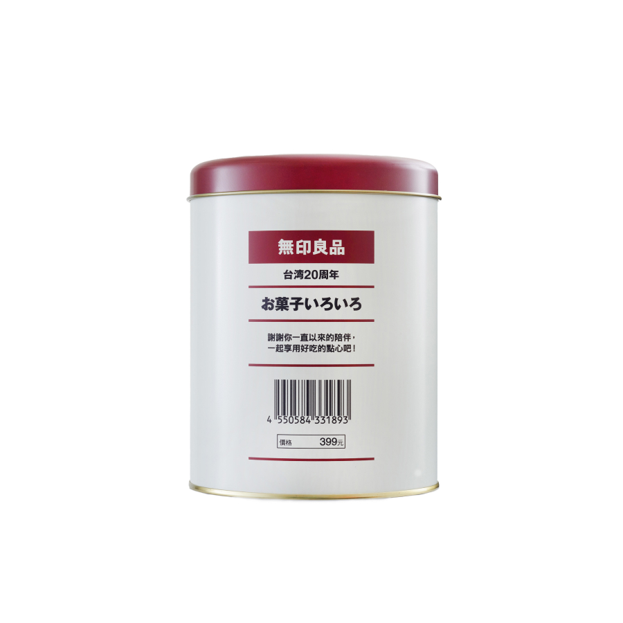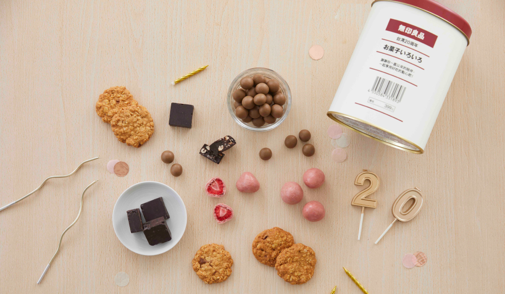台灣20週年生日桶,399元:生日桶內包含燕麥餅乾、黑可可米果磚、珍珠奶茶可可球和無選別草莓可可含餡草莓,多種口味一次滿足。MUJI無印良品希望與您共享歡聚時光,創造更多的快樂回憶。(數量有限,售完為止)