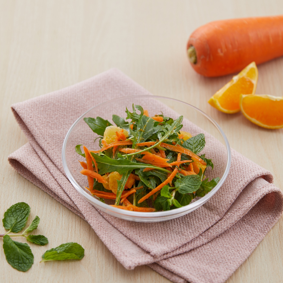 水果胡蘿蔔柳橙醬沙拉,60元:使用台灣雲林東勢VDS胡蘿蔔、愛文芒果、新鮮柳橙與水菜等綜合蔬菜絲,拌入酸甜柳橙醬汁,清爽開胃又富含營養價值。(僅限提供餐飲服務的門市販售:Café&Meal MUJI統一時代店、松高、大立與岡山門市,每日限量,售完為止)