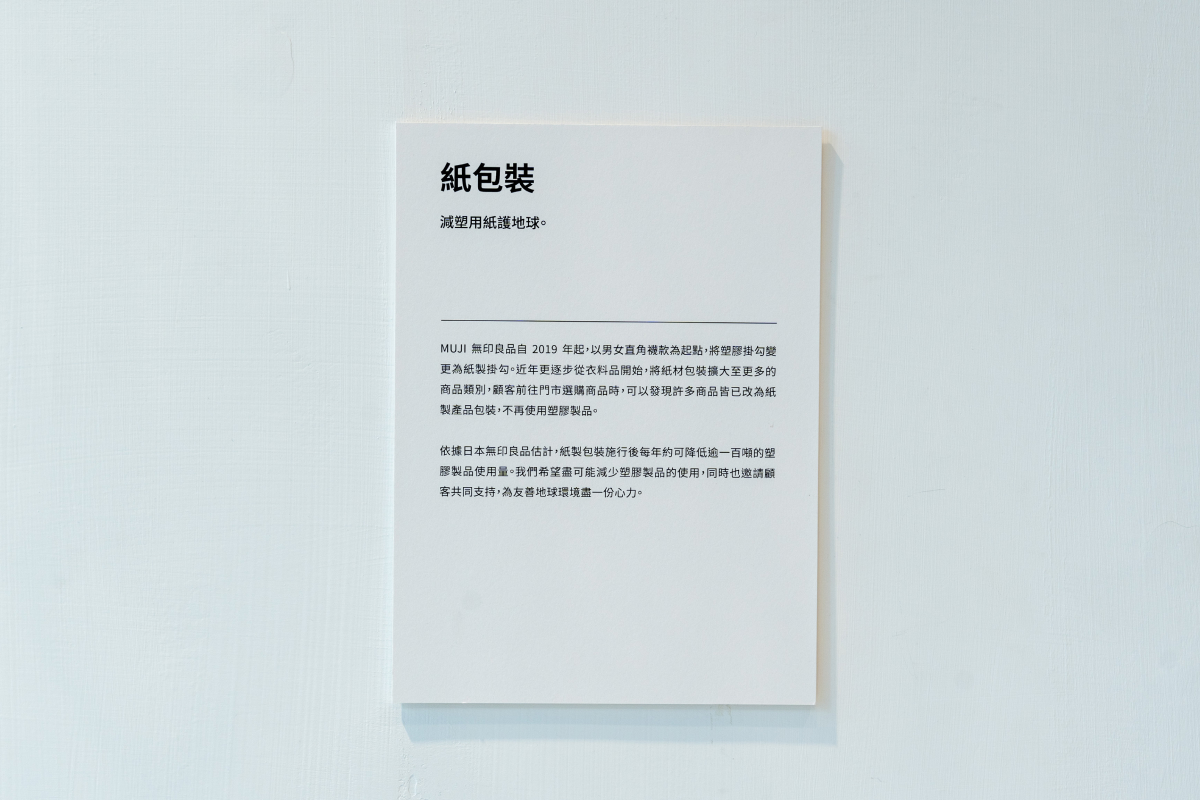如今,顧客前往門市選購商品時,可以發現許多商品皆已改為紙製包裝,不再使用塑膠製品,像是日常消耗品的洗漱用具、芬香用品及清潔道具用品等等。依據日本無印良品估計,紙製包裝施行後每年約可降低逾百噸的塑膠製品使用量。MUJI無印良品希望盡可能減少塑膠製品的使用,同時也邀請顧客共同支持,為友善地球環境盡一份心力。