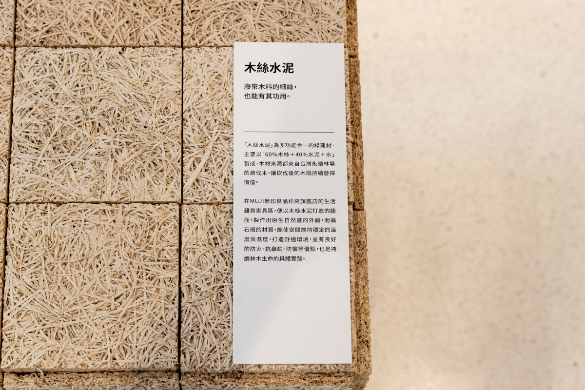 MUJI無印良品松高旗艦店的生活雜貨家具區,便以「木絲水泥」打造牆面,不僅擁有良好的防火、抗蟲蛀與防霉等優點,也是持續林木生命的具體實踐。